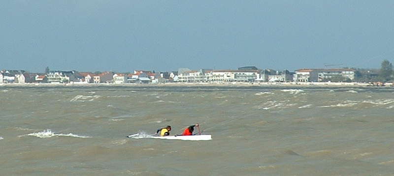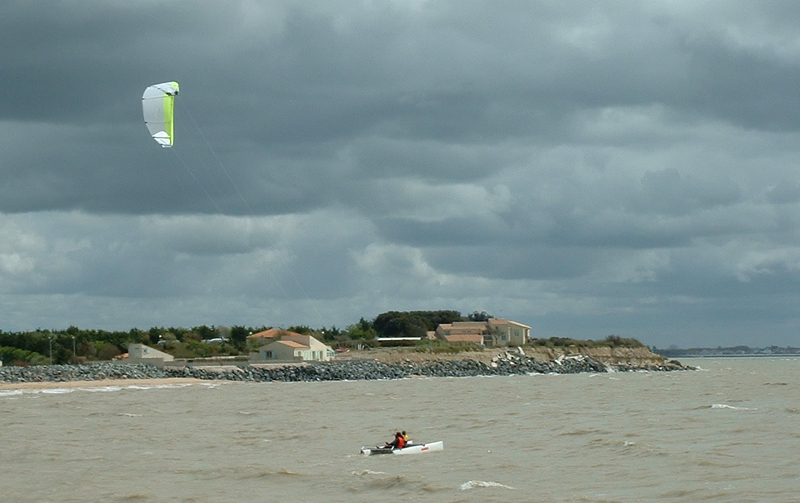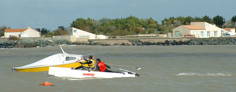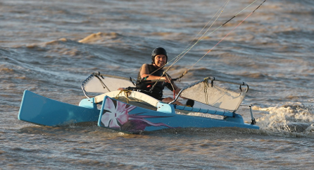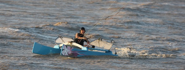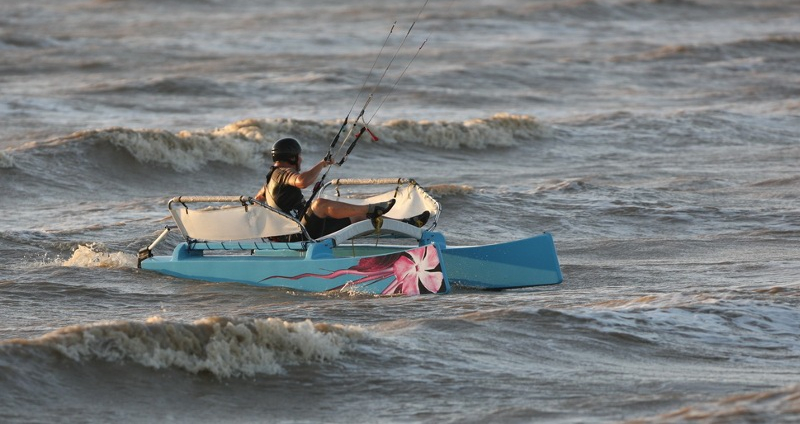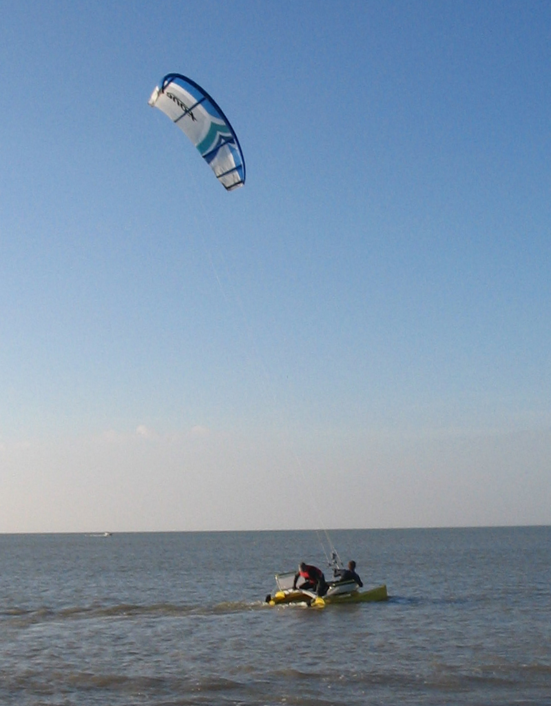 Vient alors le moment de mettre le bateau à l'eau et de le tester. Par la suite, Pierre Gainza s'est même aventuré à naviguer seul : une main sur la barre (du kite) et l'autre sur la barre (du bateau).