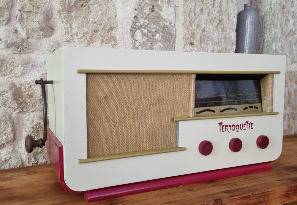 Pour ce prototype, j'ai choisi un poste TSF de ma collection qui était complètement HS et bien destroy extérieurement. C'est un Ondia 217 de 1938. Je l'ai restauré et l'ai équipé d'une manivelle de moulin a café made in déchetterie.