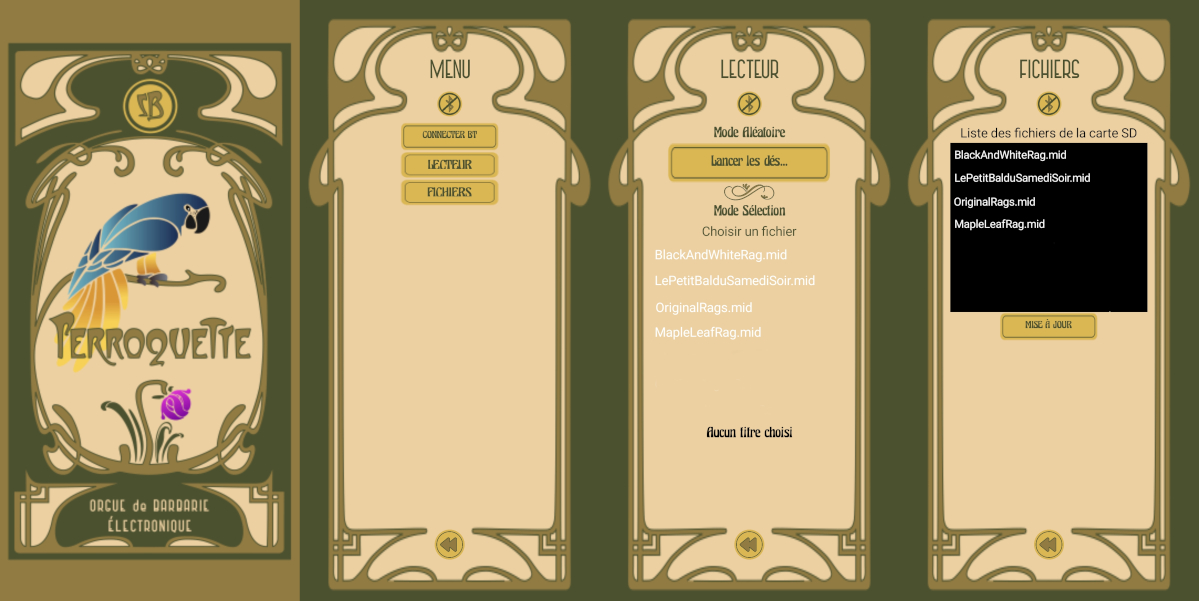 Il y a un autre écran qui n'est pas représenté, c'est l'écran de lecture avec des boutons "Lecture", "Pause", "Stop" et le réglage du volume. Sur ce prototype, il y a aussi un bouton de réglage du volume directement sur la Perroquette, c'est plus pratique pour ajuster le volume lorsque l'on joue.